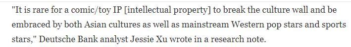 《福布斯》杂志网站报道说,这个长着尖耳朵、锯齿状牙齿和狡黠笑容的兔子状玩偶正在商店里掀起狂潮。报道援引德意志银行的分析报告说,很少有IP能打破文化壁垒,同时被亚洲文化接纳,又被西方流行音乐和体育明星所喜爱。